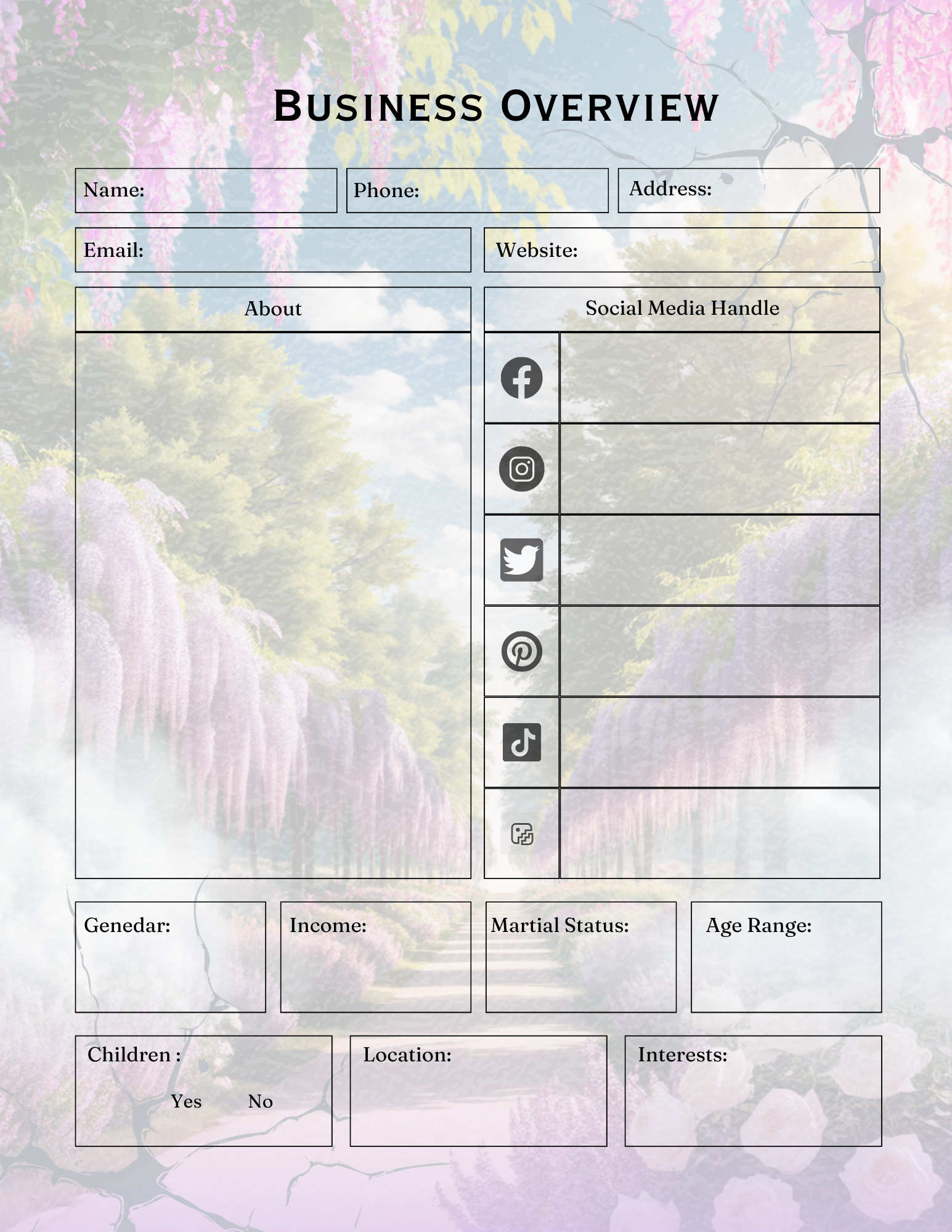 • Business overview & contact sheets